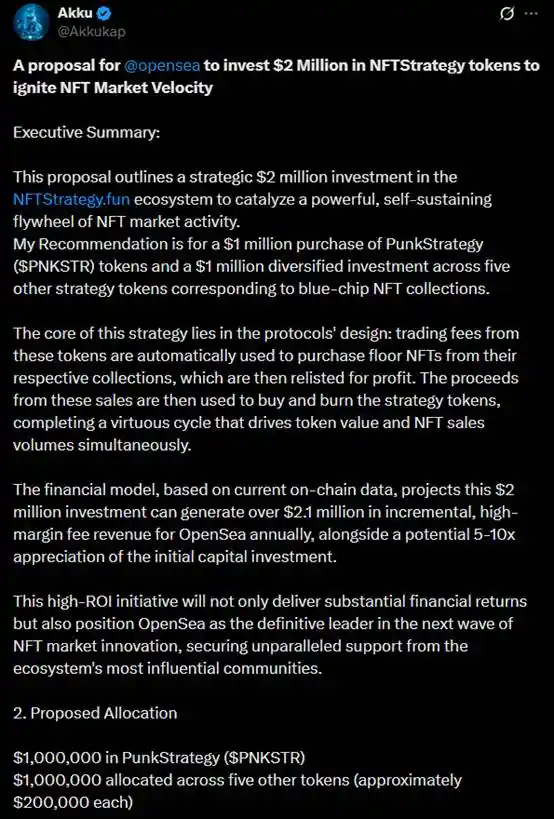 关于 NFTStrategy 的讨论目前仍然保持热烈。在昨天,有一篇提议 OpenSea 花 200 万美元购买 NFTStrategy 相关**的推文引发了不少讨论。