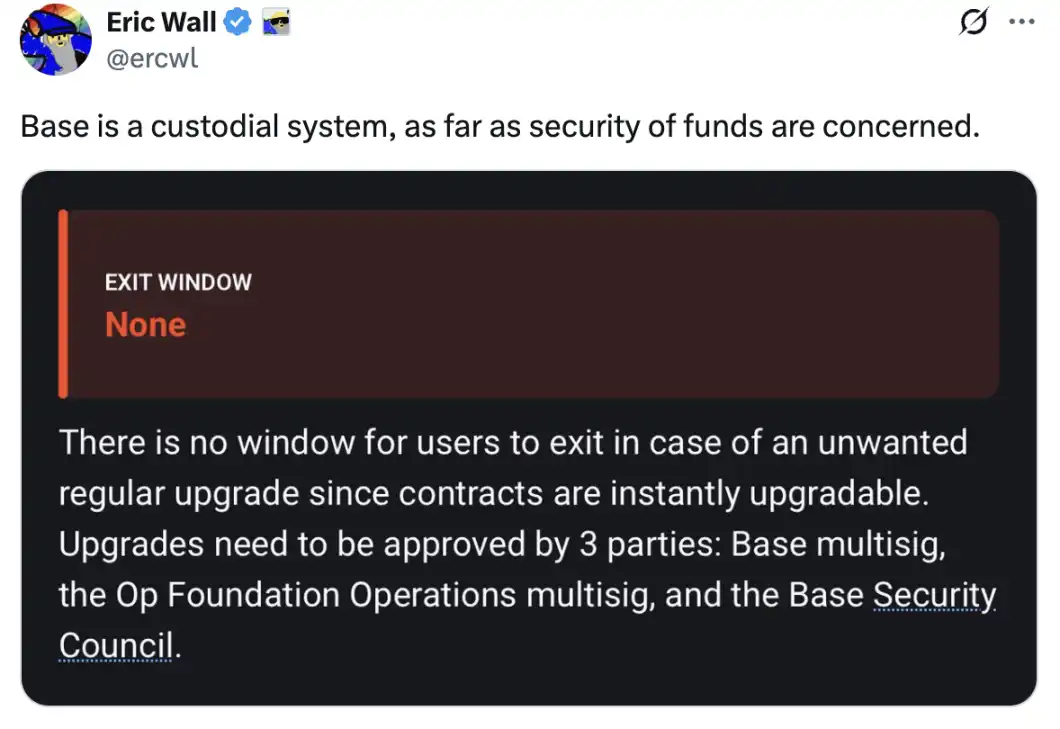 Vitalik 观点中认为 Base **化排序器是为了可扩展性和用户体验也引发了大量的争议。Taproot Wizards 联合创始人 Eric Wall 表示,就资金安全而言,Base 就是一个托管系统,并指出 Base 的合约仍然可以通过治理进行升级,这意味着运营商及其相关实体(通过安全委员会)保留了相当大的自由裁量权。在他看来,这使得 Base 在功能上更接近于托管系统,而不是**信任**化的以太坊扩展。Eric Wall 还在评论区表示,Vitalik 发表观点的措辞会让读者认为即使出现密钥泄漏也不会导致资金损失,如此表达很不负责任。