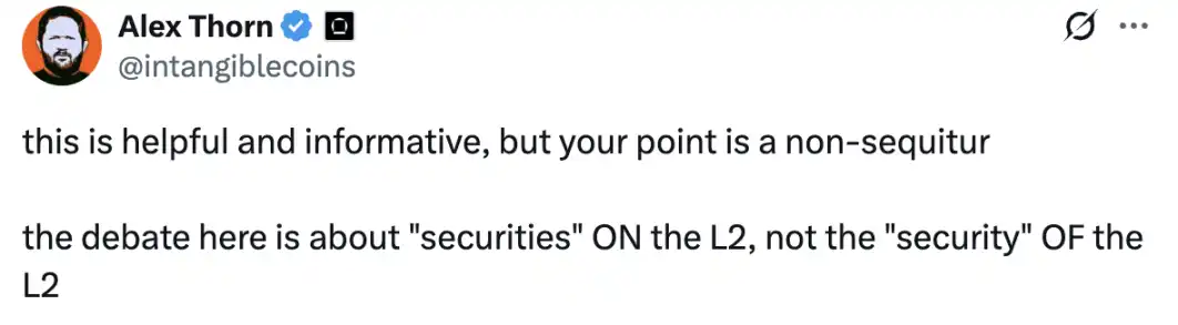 Galaxy 研究主管 Alex Thorn 认为 Vitalik 的观点并没有切中要点,其表示,讨论的**应是 L2 上的证券(securities),而不是 L2 的安全性(security)。虽然 Alex Thorn 没有明示,但其观点却指向了一个非常致命的问题:L2 本身并非交易平台,但如果 L2 上的交易平台是建立在一个非常**化的链上,那么这些交易平台是否还能被称为 DEX 以及是否应该受到监管?