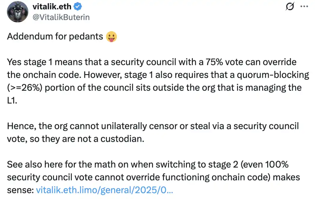 正在开发 Cardano L2 Midgard 的 Anastasia Labs 创始人在 Vitalik 的补充评论下犀利地发表了「解读」:将「安全委员会」理解为「多重签名」;将「75% 投票」理解为「7 个私钥」;将「要求委员会中可以通过大于 26% 投票权否决提案的个人独立于管理 L2 的组织之外」理解为「要求该组织使用空壳公司、朋友的公司、经过混淆的子公司或合作伙伴公司来持有多重签名所需的 3 个私钥」。