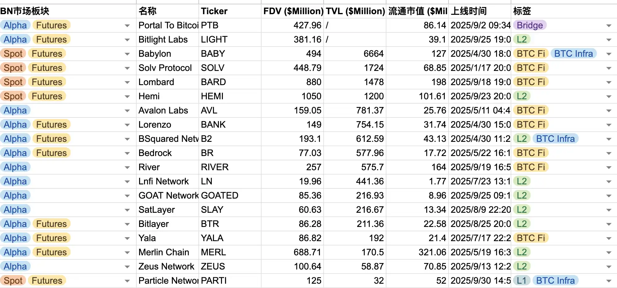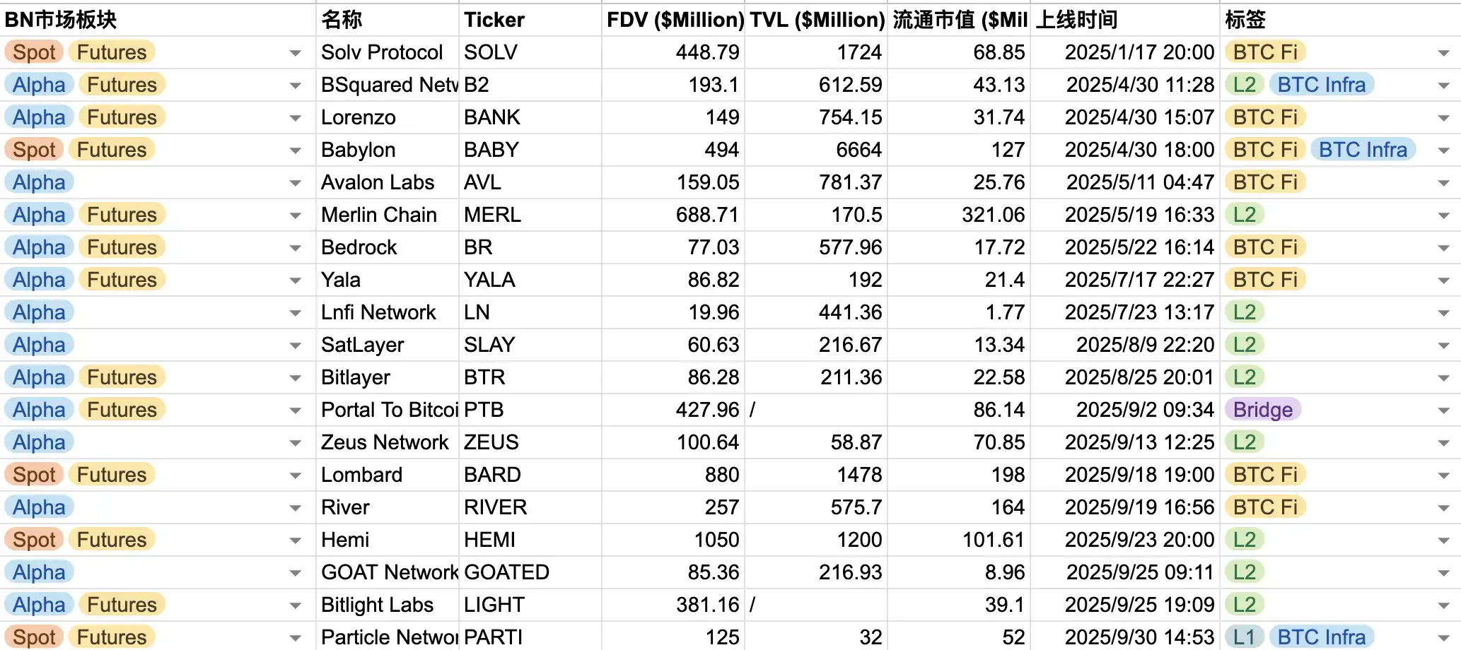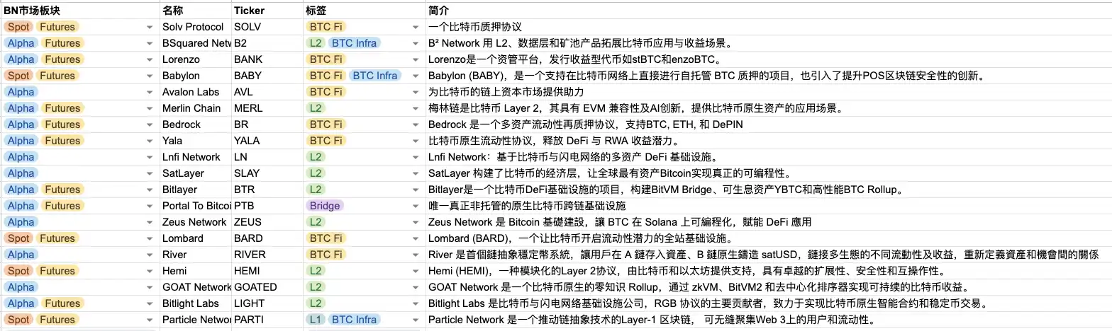 币安 Alpha BTC 概念项目上线日期汇总,快照时间:9/29/2025