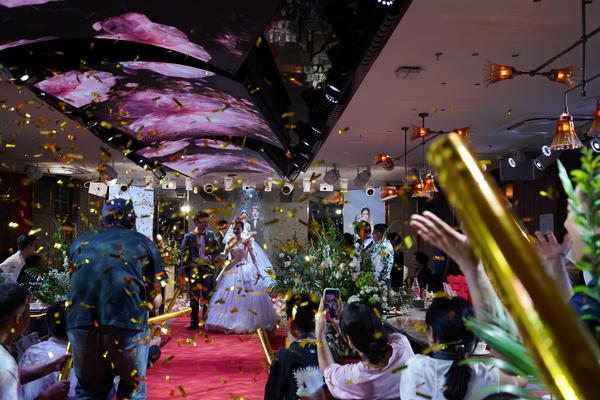 山东日照的教师新人则更看重“极简”与“松弛感”,在海底捞摆下 十余桌婚宴,没有繁琐流程,只有亲友围坐火锅旁的轻松畅谈;河北石家庄一场 超50桌、近 300 人的大型婚宴更显热闹,红色喜饰与火锅热气交织,长辈们看着年轻人举杯欢笑,感慨“这样的婚礼才是年轻人喜欢的”;而在深圳,****海底捞宴会店还上演了 “直升机空降婚礼”,新人乘直升机抵达门店,将低空经济的新潮与 “甜蜜经济” 的浪漫巧妙融合,成为假期消费中一道亮眼的新风景……