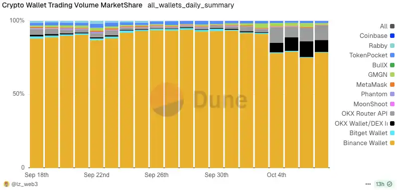Binance钱包于去年末推出,刚刚上线时饱受争议,而自Binance Alpha 上线后,如今Binance钱包无论是交易量、用户活跃度都已经稳居加密钱包**的位置,根据 Dune 数据,Binance钱包已占据了加密钱包市场 90% 的份额。