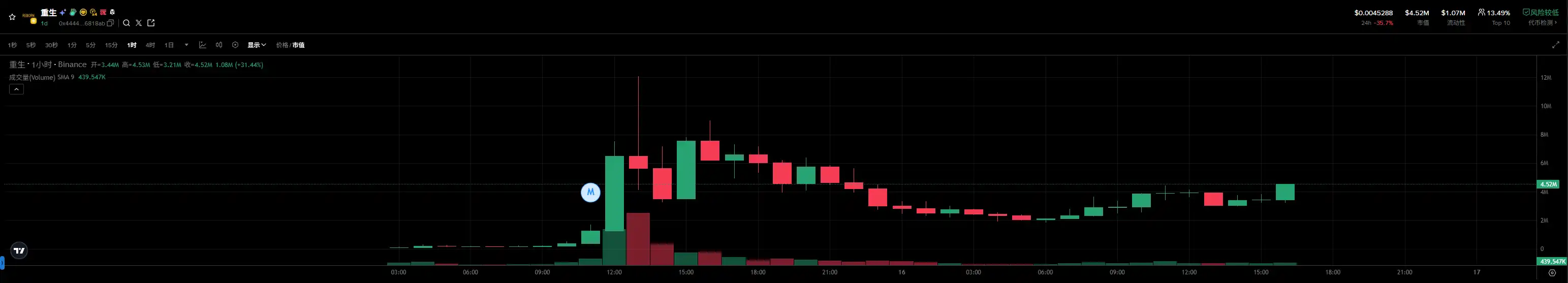 **聚集起玩家们的共识并跑出来的「重生」币,是合约地址以「4444」为结尾的。从下面的 K 线图可以看到,从成功发射出来后,合约以「4444」为结尾的「重生」币就开始了上涨,**市值一度突破 1500 万美元。