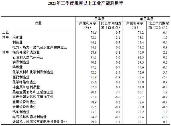 分主要行业看,2025年三季度,煤炭开采和洗选业产能利用率为68.9%,食品制造业为70.1%,纺织业为77.2%,化学原料和化学制品制造业为72.5%,非金属矿物制品业为62.0%,黑色金属冶炼和压延加工业为80.1%,有色金属冶炼和压延加工业为77.8%,通用设备制造业为78.9%,专用设备制造业为75.5%,汽车制造业为73.3%,电气机械和器材制造业为74.9%,计算机、通信和其他电子设备制造业为79.0%。