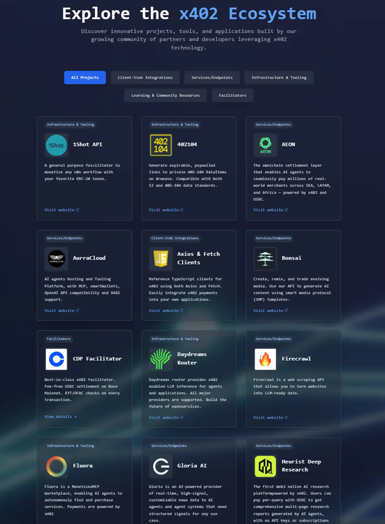 在 x402 协议的官网上的 Ecosystem 页面有着当前的项目汇总。如果一个一个项目点进去查看的话,会感觉到这个协议仍然处在一个相当早期的发展阶段。点进去直接是技术文档或跳转到 Git** 的项目也不少。