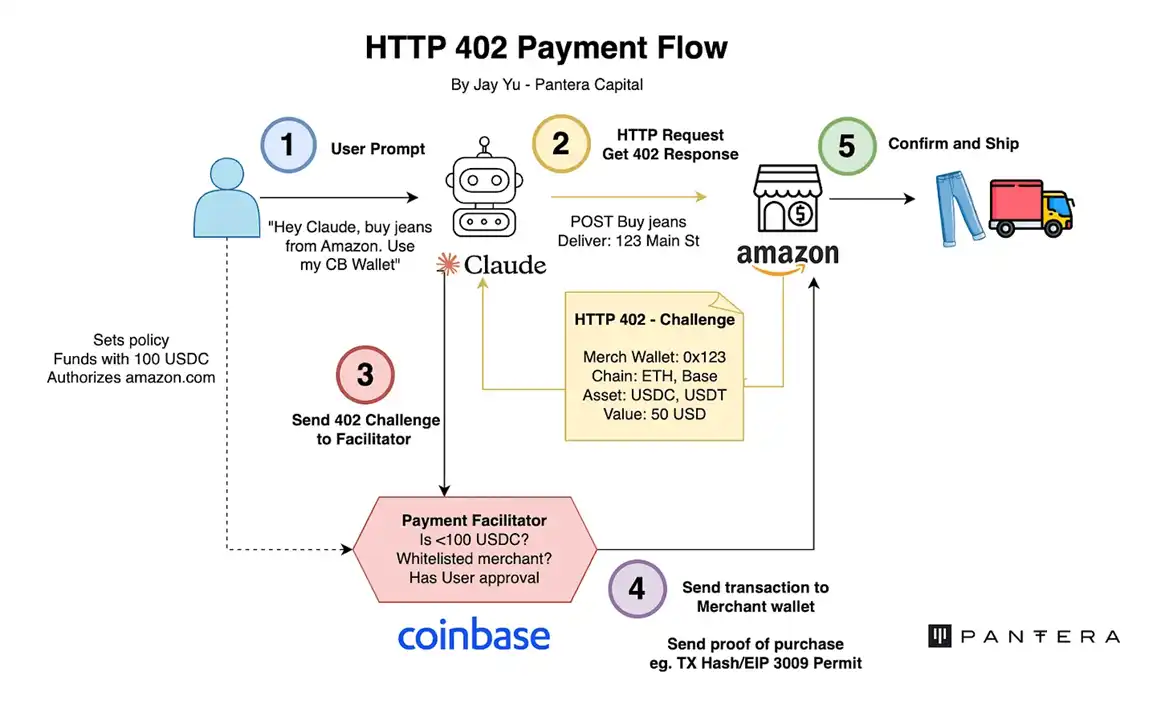 用户向 Claude 提出一个请求,「使用我的 Coinbase 钱包,帮我在亚马逊上购买一条牛仔裤」。AI 收到请求后,向亚马逊发起购买请求,然后亚马逊方构造了一个初步的交易,包括将使用的钱包地址、将使用的链、币种以及具体金额。AI 收到之后,将这个交易发送给 x402 协议的验证器,检查对应钱包对应链上是否具有足够的资产、商品是否可交易以及用户是否确认授权。都完成后,将金额以及付款证明发送至商家地址。至此,交易完成。