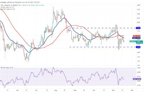 11 月 18 日烛台上的长灯芯表明空头正在捍卫移动平均线。6.20 美元的下行 20 日均线和略低于中点的 RSI 表明空头处于优势。突破并收于 5.66 美元下方可能会为重新测试 5.14 美元扫清道路。