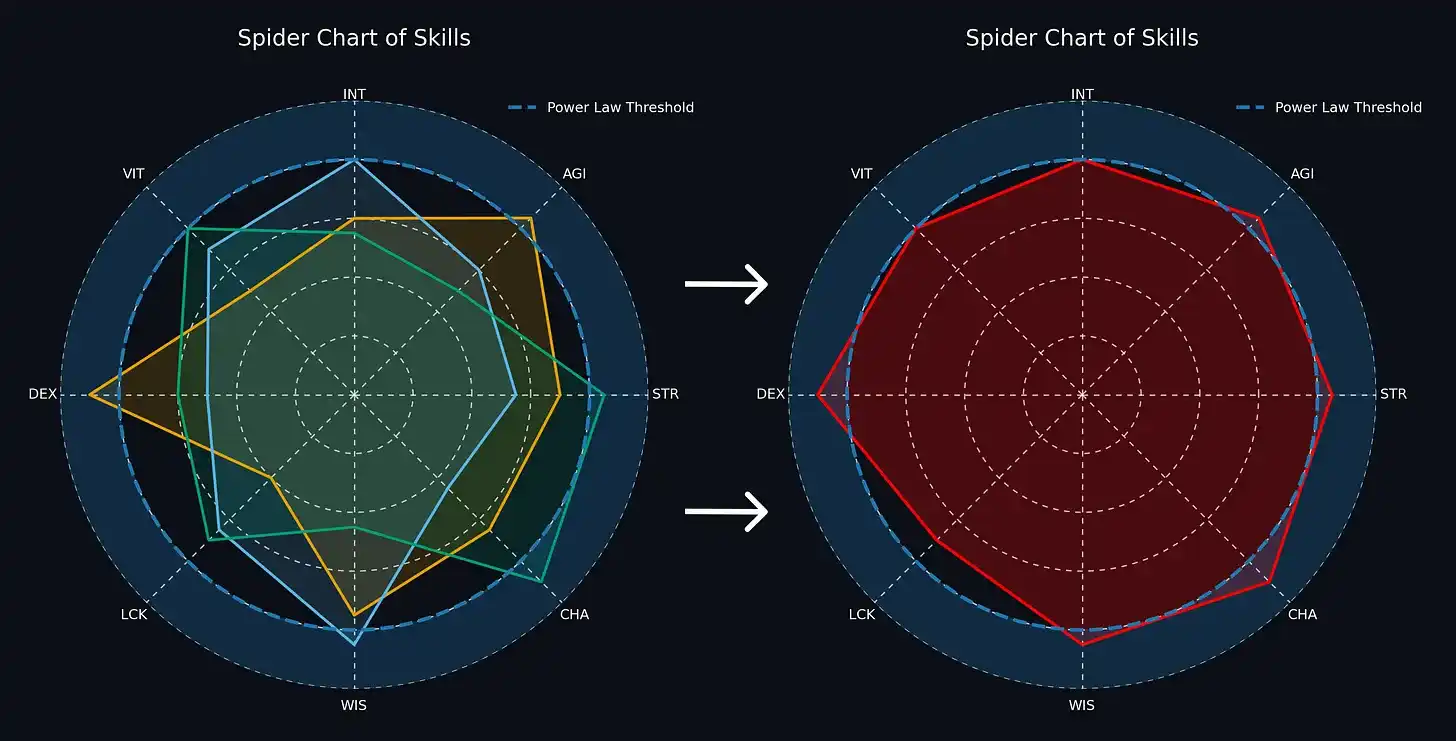4)这个游戏是赢家通吃的。如果你想持续赚钱,就要填满属性圆圈,跨越幂律阈值。