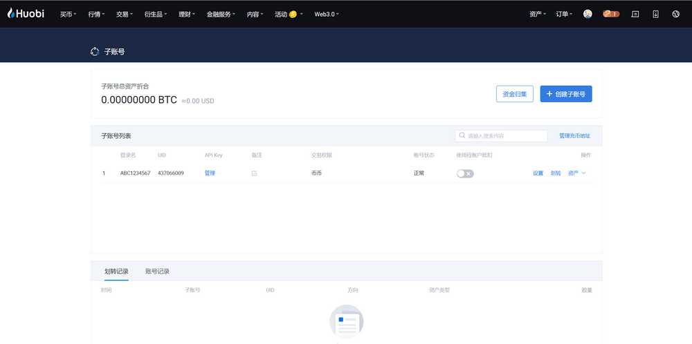 6.点击【划转】即可实现主账号现货账户与子账号现货账户的自由划转。