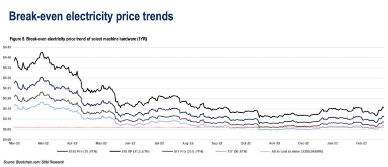 不过随着比特币价格的飙升,美国投行Stifel周一在一份分析报告中表示「今年的**季度将成为一个更好的季度」。根据下图,同样单位的每秒算力下消耗50瓦电力设备的盈亏平衡电价,一直在一度电0.06美元左右。