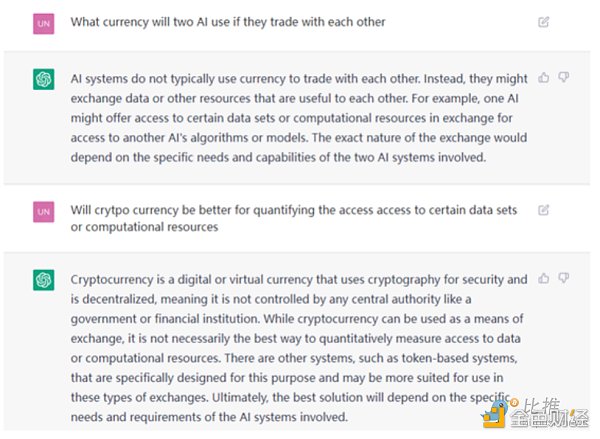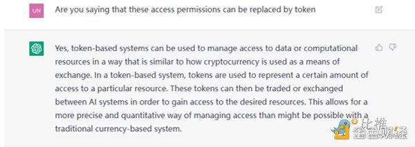 如果 AI 要相互交易,他们会用法定货币还是数字货币进行交易?我问 ChatGPT 这个问题,它回答说,与传统货币相比,用**对数据访问进行量化定价是一个更好的解决方案。