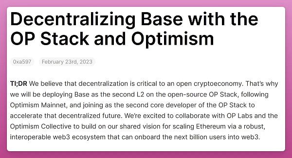 更重要的是,美国**加密货币交易平台 Coinbase 基于 OP Stack 推出了自己的 L2——Base。Coinbase 将以核心开发人员的身份加入 Optimi** Collective(Optimi** 的 DAO),继续完善和推广 OP Stack——这是 Optimi** 开发的由一系列模块组成的开发工具包,可以用于开发特定的区块链。