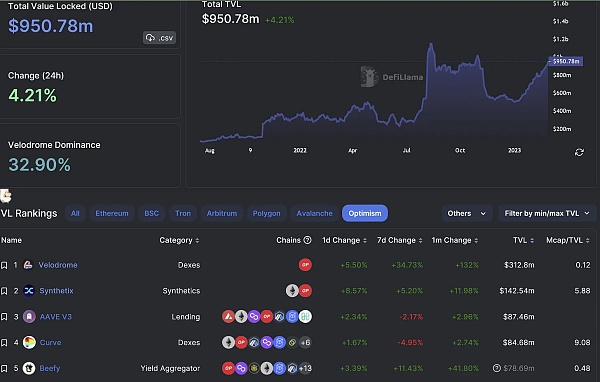 Optimi** 虽然低于 Polygon 和 Avalanche,但同期 TVL 增加了 35%,达到 9.5 亿美元。
