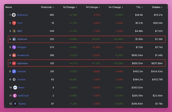 DeFi 生态系统Arbitrum 和 Optimi** 上 DeFi 生态系统的增长速度都比**其他 L2 甚至 L1 都快得多。Aribrum 的 TVL 在短短一个月内增长了 62% 至 11.5 亿美元。已经超越了 Polygon 和 Avalanche。