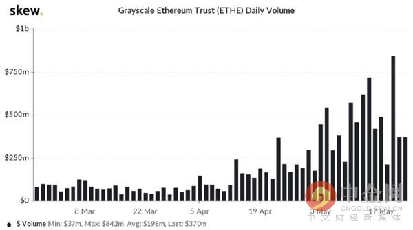 以太坊信托的日成交量下降了,就像期货的日成交量一样。上次这个信托的成交量达到这个水平的时候,以太坊的价格反弹到了3000美元的水平。如果成交量保持在这个水平以下,那么最初的反弹将是可持续的。