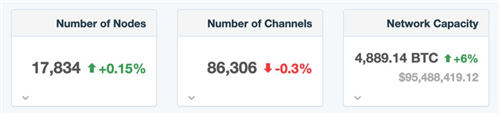 另外,据1ML平台统计数据,比特币闪电网络锁定的BTC数量不畏市场熊市,仍持续稳定成长来到4889.14枚的历史新高、过去30天增幅达6%;当前闪电网络节点数量也来到17,834个,过去30天增幅为0.15%。