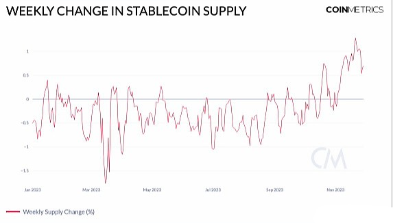 在2022年6月Luna崩溃和今年3月硅谷银行(SVB)危机等重大事件之后,我们观察到稳定币的总供应量显著下降,表明市场信心的动摇。然而,自2023年10月以来,稳定币总供应量呈上升趋势,标志着向正增长的转变。这种上升趋势可以被视为链**动性改善的**指标,表明出现了更多可部署资金的环境。