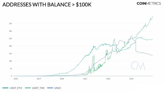 现在让我们将注意力从智能合约的供应转移到更广泛的稳定币采用趋势上,这反映在大量持仓的账户数量上。虽然持有超过10万美元USDC的地址数量已经下降到了1万3千个地址,并且以太坊上的USDT地址保持相对稳定,但Tron网络上的USDT则呈现出不同的趋势。Tron上的Tether采用率持续增长,有近4万个地址持仓超10万美元。这可以归因于其较低的交易费用,以及在拉丁美洲、非洲和亚洲部分新兴经济体中越来越多的采用。在这些地区,人们经常面临着高通胀,很难获取以美元计价的金融服务,通过稳定币轻松并经济地获得美元已成为一种特别可取的方式。