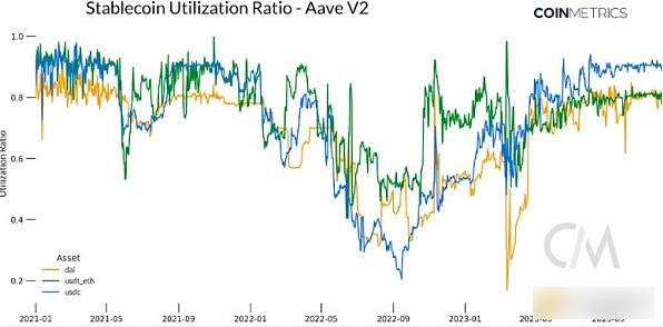 池利用率与利率之间也存在着至关重要的关系:当池中资金充足但借贷需求较低(即利用率低)时,利率就会**以吸引借款人。相反,当池中流动性稀缺(即高利用率)时,利率就会上升以激励债务偿还吸引新存款。除了2023年3月出现的混乱之外,USDT、USDC和Dai的利用率已攀升至2021年的水平,这表明对稳定币抵押**需求有所增加,以及对于利用这些资产进行创收的策略的兴趣在不断上升。