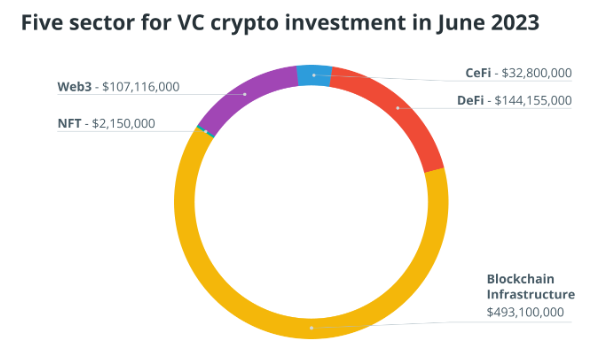 去**化金融 (DeFi) 通过 20 笔交易和超过 1.44 亿美元的投资重新赢得了一些份额。令人惊讶的是,6 月份 Web3 不太受风险投资家欢迎,18 笔交易的金额约为 1.07 亿美元。**化金融 (CeFi) 和非同质** (NFT) 分别以约 3200 万美元和 200 万美元的投资以及一轮和三轮单轮融资再次跻身榜单。
