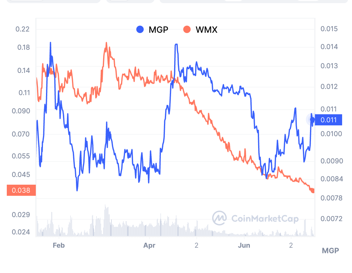 subDAO 模式就不一样了,比如 Penpie/ $PNP 作为一个独立项目,不但没有增发** $MGP, 并且牢牢绑定了 Pendle 的叙事。虽然表面上看 $MGP 币价没有什么变化,但 MGP 是一个 Wombat 起家的项目,同类项目 WMX 已经最近跌了 70% 了,如果没有 Penpie 的话,不难想象 MGP 会如何。