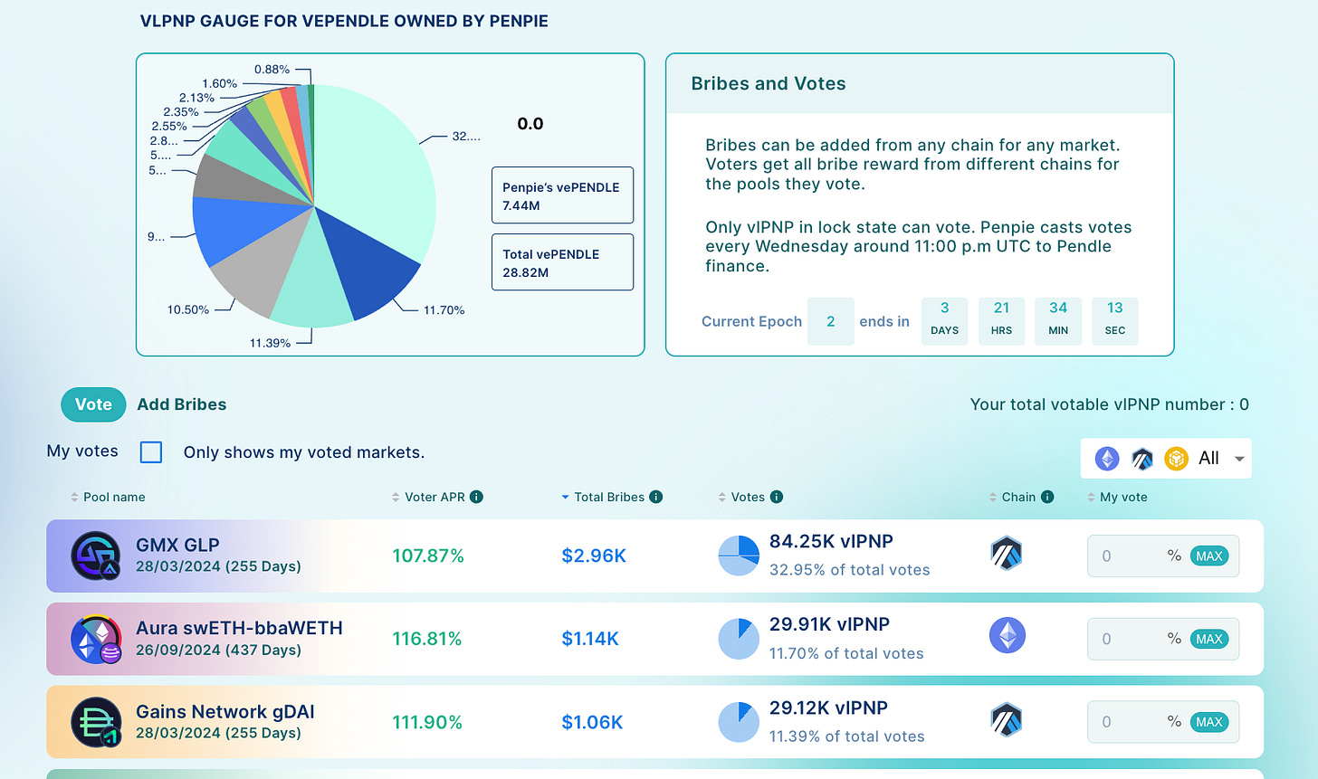 以 Magpie 为例,名义上 Magpie 控制了 20% Penpie 的治理权,Penpie 又控制了 25% Pendle 的治理权。从一方面讲,Magpie 享有 20%x25%=5% vePendle 的各项收益,但从另一方面讲;对于 协议治理, yes or no 这类问题,20% 的 Magpie 的投票将会很大程度上决定 Penpie 的投票,也就是说其实是有近乎 25% 的 Pendle 治理权。