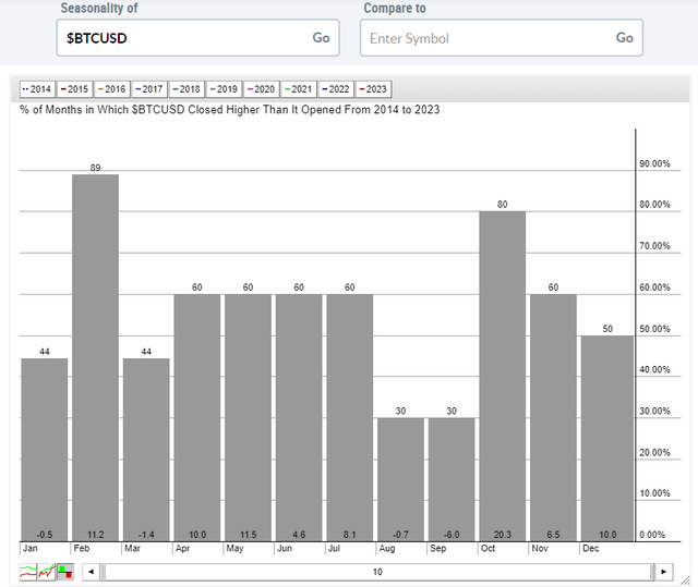 从季节性角度来看,12 月是比特币一年中表现**的月份之一,最近的表现可能已经拉动了通常强劲的年终回报。1 月份实际上是 BTCUSD 在 2 月份出现历史性大幅上涨之前表现第二差的月份。这些是在计算 BKCH 进入和退出时间时要考虑的关键模式。