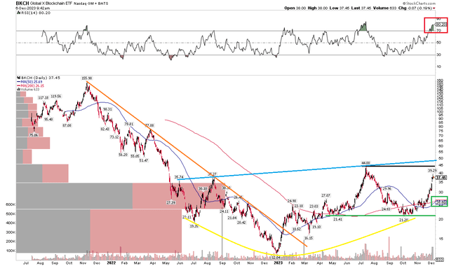 过去两个月,BKCH 的运行令人难以置信。请注意,在下图中,股价在 10 月初触及 21.20 美元的低点,然后飙升至 39.29 美元的近期高点。图中发生了很多事情,所以让我们深入研究一下。