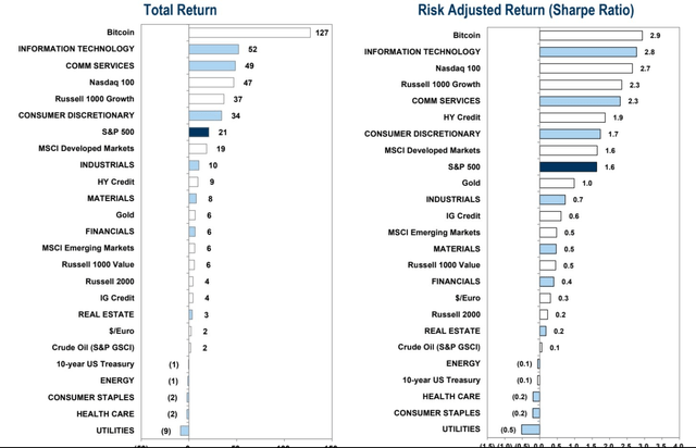 比特币(BTC-USD)又回来了。我每周都会查看高盛 Kickstarter 报告。在众多揭示性图表中,有年初至今的总回报率和风险调整回报率(夏普比率)视图。猜猜上面是什么——比特币。该加密货币在 2022 年 6 月触底后,目前已同比上涨 160% 以上,距离 1.6 万美元不远。随着 BTCUSD 较两个月前的低点上涨约 50%,如果再次出现如此规模的反弹,比特币将逼近 6.9 万美元的历史高点。今年迄今为止,BTCUSD 上涨了约 160%,超过了标准普尔 500 指数 20% 的总回报率。