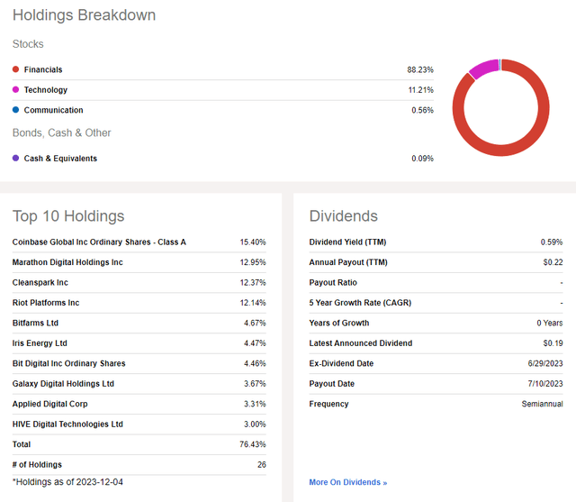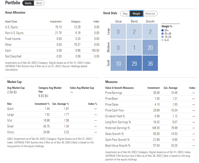 深入研究投资组合,配置风险如此之大的原因之一是它主要是小盘成长基金。投资组合中只有 4% 被视为大盘股,只有 10% 属于价值型。因此,影响其表现的并不是宏观/周期性因素,而是数字技术和加密货币领域的基本面和技术波动。市盈率在 30 以上,并不便宜,但长期 EPS 增长据报道高于 16,使得 PEG 并不是很高。Global X 指出,截至 2023 年 11 月 30 日,该基金对标准普尔 500 指数的贝塔系数高达 1.31。