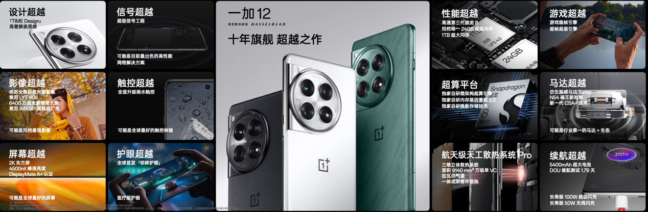 一加 12 秉持「产品力优先」理念,配置**拉满,全球**行业**把显示、护眼、流畅性同时做到**的 2K 东方屏、完整搭载 Find 影像团队倾力打造的「新一代超光影影像系统」以及由第三代骁龙 8 移动平台、LPDDR5X、UFS 4.0 组成的性能铁三角,从多个维度为用户带来超越 Pro 级的旗舰体验。