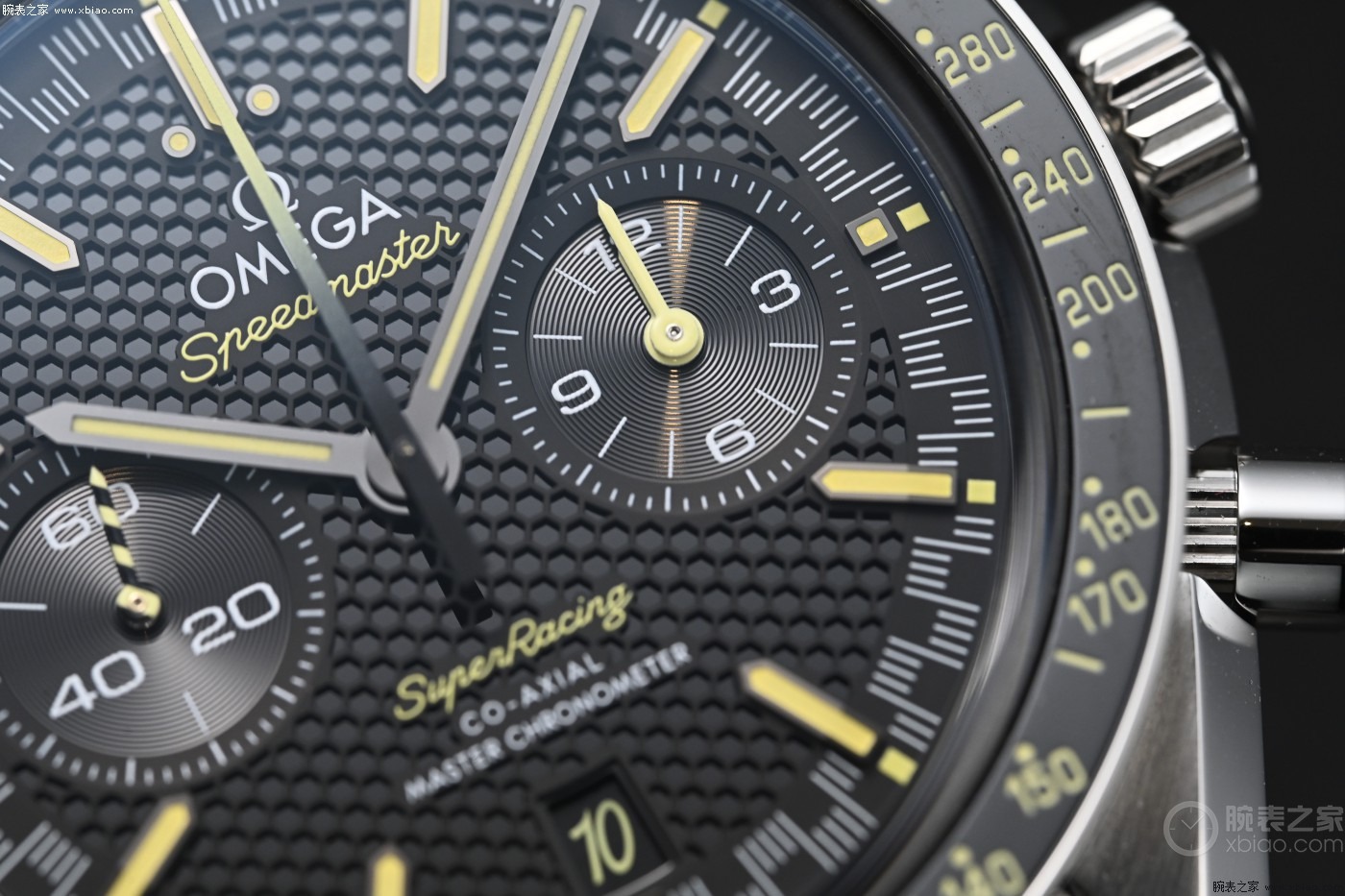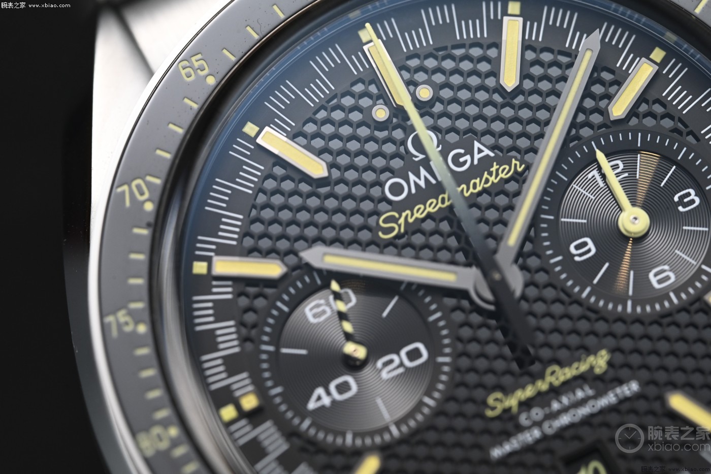 手表的表盘饰以蜂巢结构造型,搭配超霸系列的赛车风格分钟刻度,可以从盘面的细节上呼应手表的名称——Super Racing。另外,黑色的表盘装饰有黄**调的时针、渐变色的秒针以及9点位黑黄相间条纹的小秒针设计,让人不禁想到在赛道上疾驰的赛车。其实欧米茄超霸系列诞生之初,就是为专业赛车手们提**确且专业的计时腕表。Super Racing回归初心,让时间变得更为**。