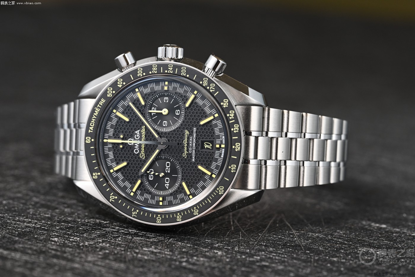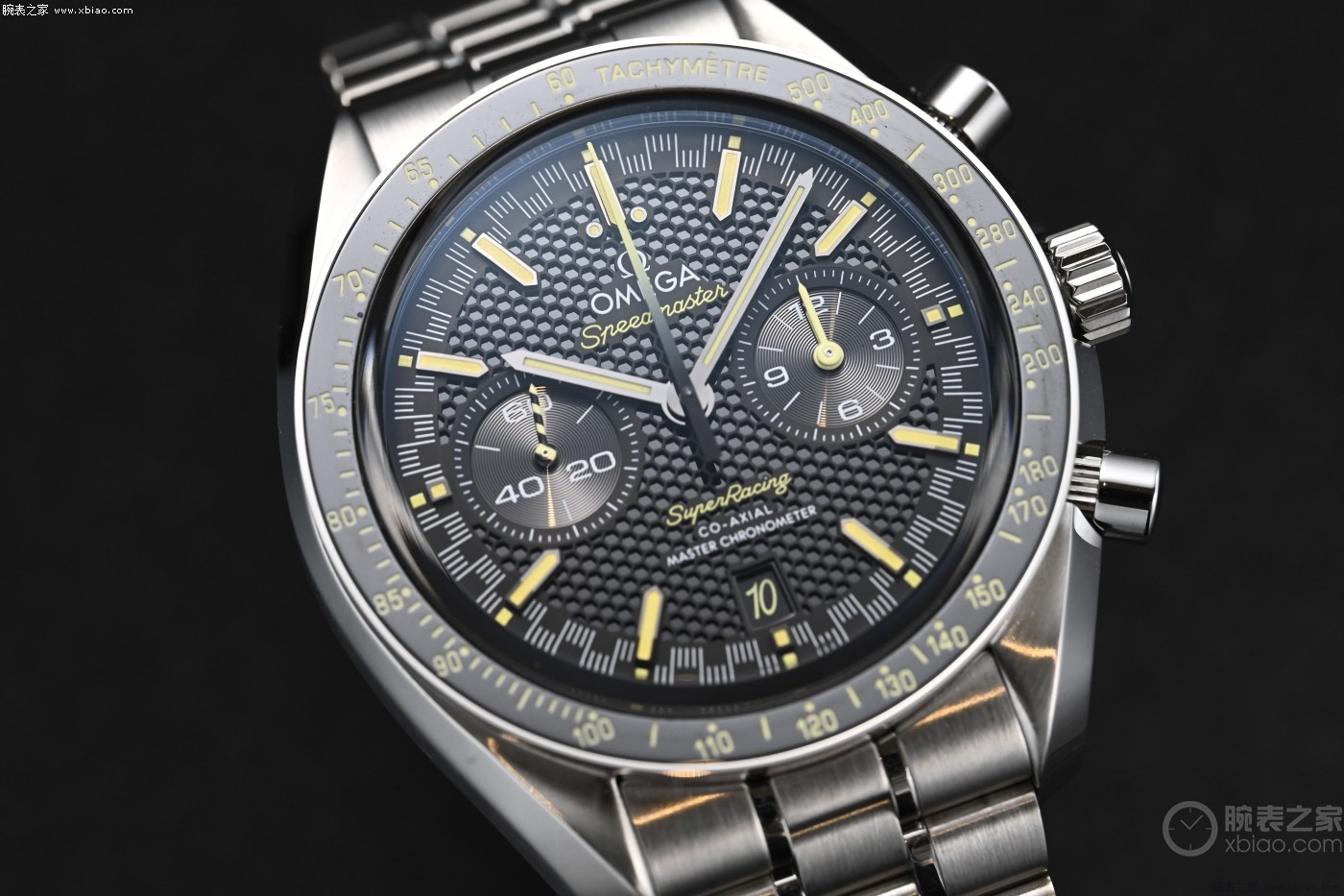 我们先来看看这只超霸系列Super Racing手表的外观设计,手表采用精钢材质打造,44.25毫米的表壳直径对腕周尺寸大的朋友更为友好。可以从实拍看到,这枚手表的表盘呈现“蜂巢”结构,灵感源自欧米茄博物馆展示的一款可抵抗160,000高斯极端磁场的概念腕表。