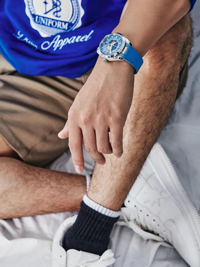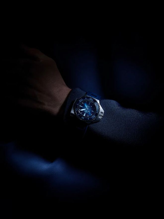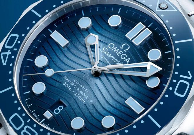 Summer Blue陶瓷表盘饰有波纹图案,呈现渐变效果,其较深的蓝**调与腕表的300米防水深度相呼应,立体的小时刻度和棒状指针具有极高辨识度,无论在海洋还是在宴会,都显得型格有致。