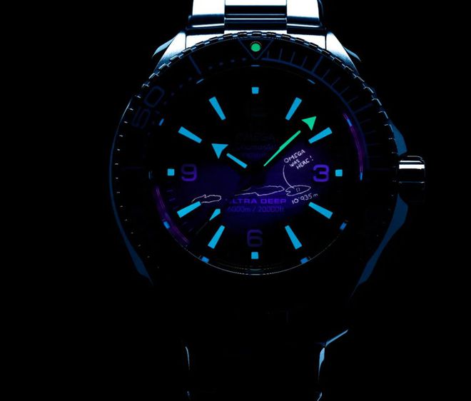 当紫外光照射在表盘上,「OMEGA WAS HERE」的字样跃然眼前,指示出Ultra Deep原型表款创造的10,935米深潜世界纪录。此外,表盘还显示出「挑战者」深渊底部的西池、中池和东池,别有生趣。