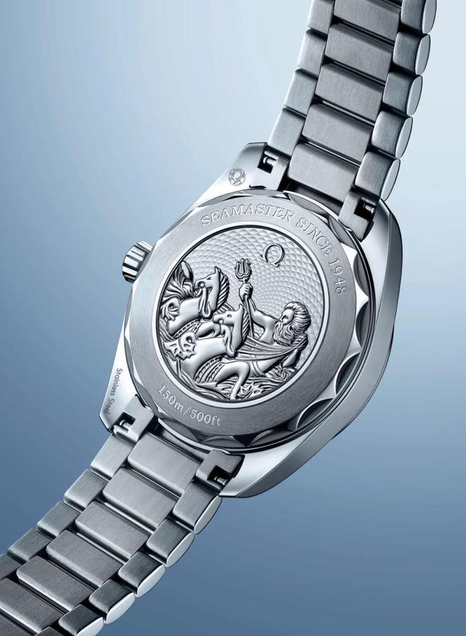 Seamaster in Summer Blue腕表背后的图案,是海神波塞冬驾驶着两匹海马,其中一匹就来自1956年最初的设计,另一匹则是经过多年演变后今天所使用的海马标识,它们本身就代表着海神的坐骑,同时也是整个系列70多年来不变的传承。