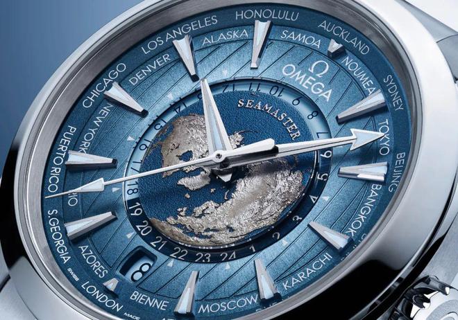 而防水深度同为150米的全新海马系列Aqua Terra世界时腕表,表盘呈现出错落有致的地球图形,周围环绕有世界各地城市的名字,并饰以银色。