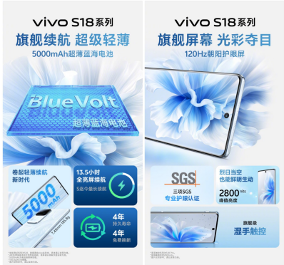 另外,vivo S18系列续航上有5000mAh超薄蓝海电池,全亮屏续航能达到13.5小时,成为S系列迄今最长续航;屏幕上有120Hz朝阳护眼屏,拿下三项SGS专业护眼认证,兼顾显示和护眼效果。