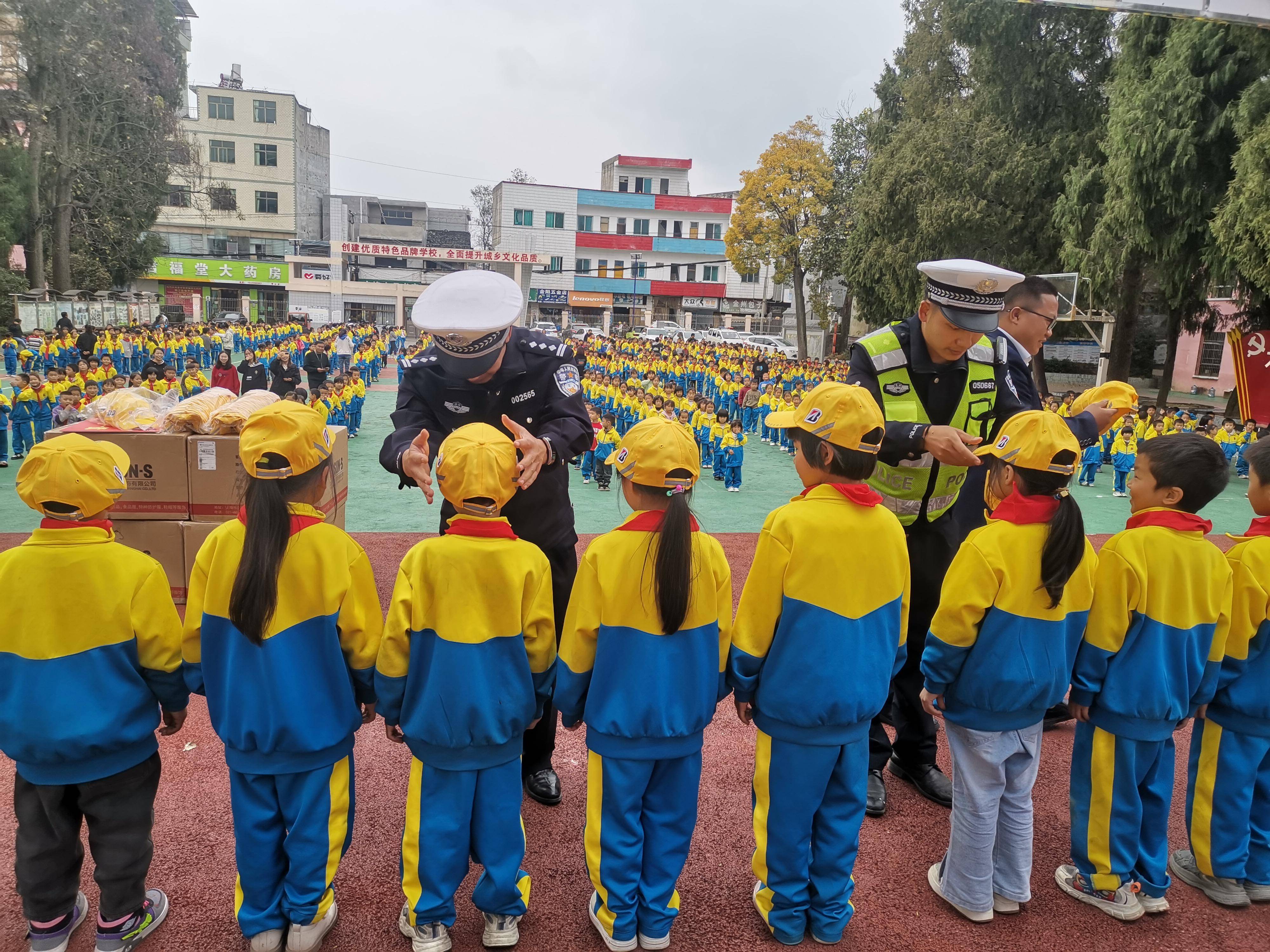 交警及普利司通志愿者为孩子们宣讲交通安全并发放捐赠物资