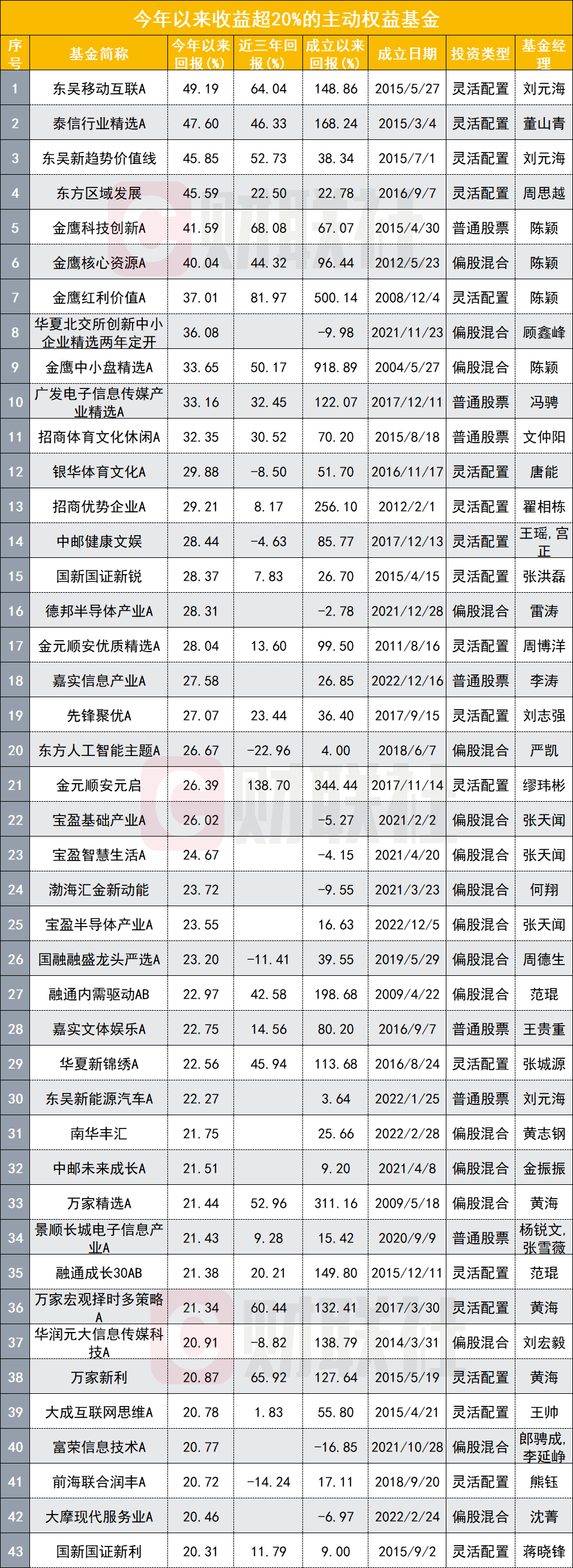 泰信行业精选、东吴新趋势价值线、东方区域发展、陈颖管理的金鹰科技创新和金鹰核心资源年内收益分别达47.60%、45.85%、45.59%、41.59%、40.04%。
