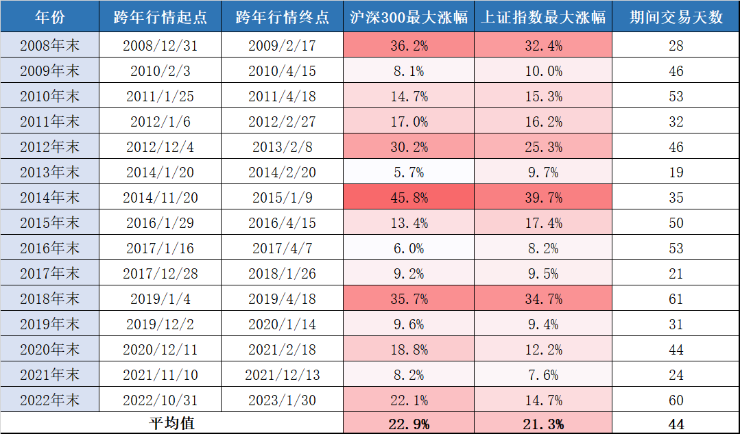 近15年来,跨年行情的演绎大多出现在11月至次年1月期间,持续时间从1个月到4个月不等。从指数表现来看,沪深300和上证指数的**涨幅可以超过20%。