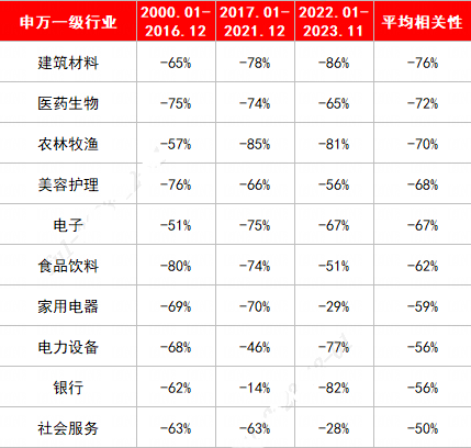 与美债利率负相关较高的行业主要是建筑材料、医药生物、农林牧渔、美容护理、电子、食品饮料等。