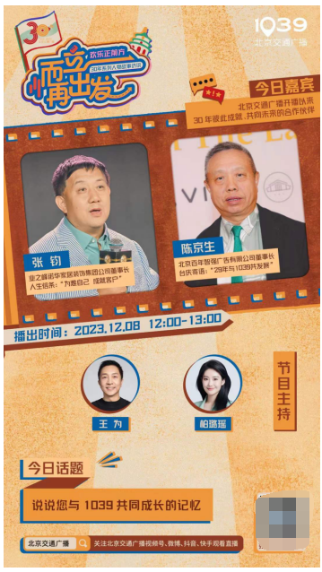 近日,为庆祝开播30周年,北京交通广播欢乐正前方栏目推出了“而立再出发——30年系列人物故事访谈”,邀请30年来彼此成就、共向未来的合作伙伴,一起说说他们与1039共同成长的记忆。