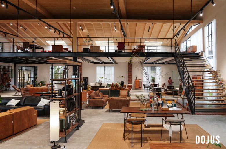 DOJUS家私集合店选址广东佛山,建筑主体原来是一个废弃的旧仓库,经过自行改造设计,现已焕然一新,成为一个4000㎡集合A馆、B馆及艺术画廊的复合型家私集合店。店内融合了主理人的过往游学所累积的经验和艺术审美,除了既定的简约硬装,展厅多以去风格化的形式呈现,并定期进行区域陈列调试,以展现更多搭配的可能性。