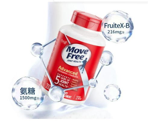 其中Move Free红瓶是经典基础款氨糖,其配方中除了含有1500mg的氨糖之外,还含有硫酸软骨素、透明质酸、FruiteX-B™果糖硼酸钙等成分。氨糖和硫酸软骨素组合被称为是关节软骨的养护搭档,可助力修护关节软骨,加强关节缓冲力;关节舒缓专利成分FruiteX-B则能起到舒缓关节不适的作用;透明质酸则是一种关节“润滑助手”,可补充关节滑液。以上成分组合作用,直达引发关节不适问题的源头,可实现标本兼顾的关节养护效果。
