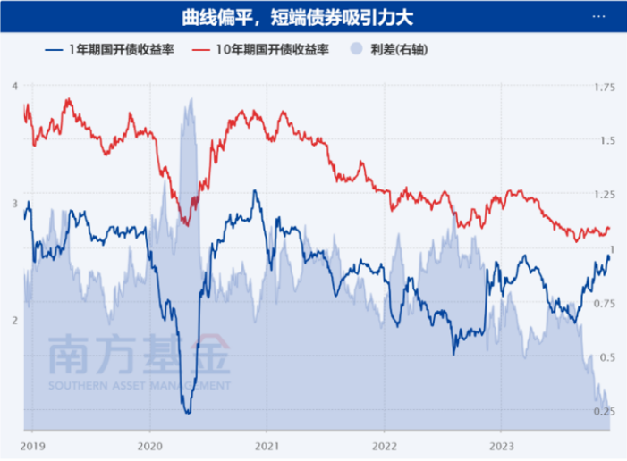 局长这里拉出了1年期与10年期国开债收益率进行对比,可以看出当前的利差较小,这对短端债券来说可能会有较大的吸引力。