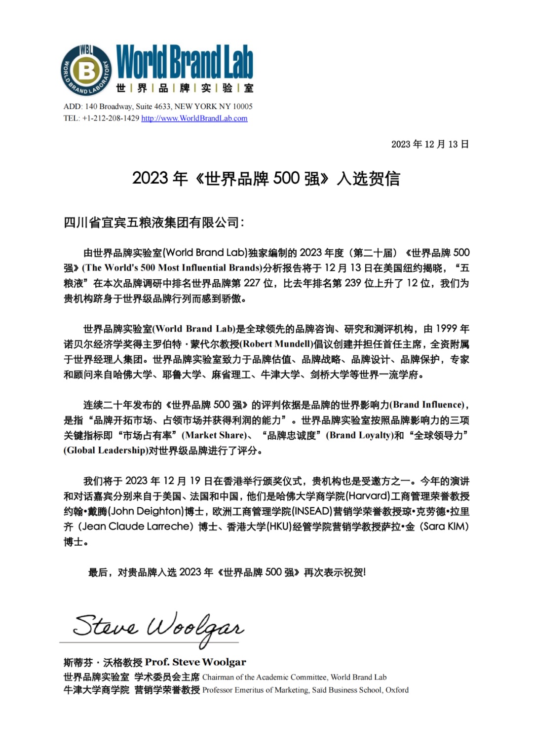 12月13日,由世界品牌实验室(World Brand Lab)发布的2023年度(第二十届)《世界品牌500强》排行榜揭晓。五粮液品牌排名较去年上升12位,位列第227名,连续7年保持两位数攀升,是食品饮料行业排名上升最快的品牌。