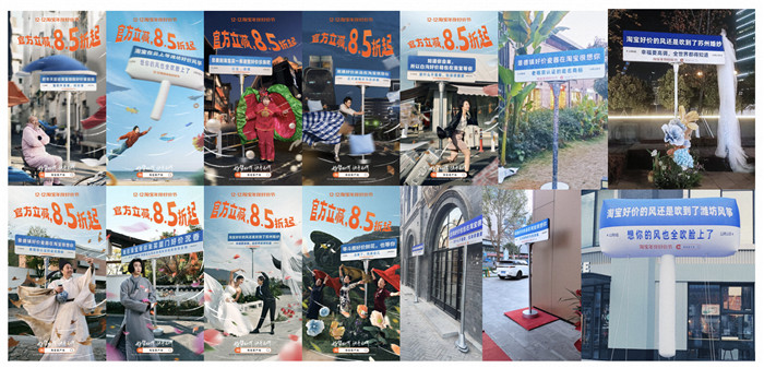这一次活动期间,网红路牌“好价风还是吹到了淘宝”闪现**,将媒介创新进行出新的演绎。在**多个产业带,这些网红路牌还进行了地域化的改造,如苏州婚纱路牌、潍坊风筝充气路牌、景德镇瓷器花纹路牌等,**属性进一步增强,吸引了不少路人进行UGC打卡。而一则题为《新闻报道:**突发大风》创意视频的跟进,更是把这波风潮带进了大众视野,向人们讲述起发生在这些路牌周围的故事。