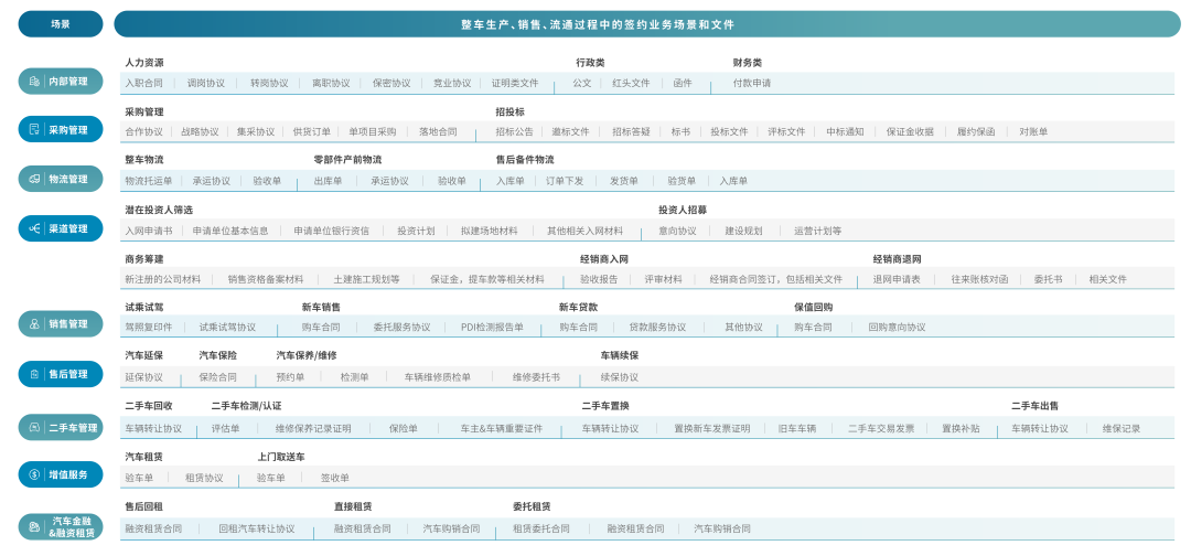 法大大电子签可无缝对接主机厂与经销商集团的招采、经销商管理、OA、物流、生产、金融租赁等系统,提供身份认证、模板管理、在线签署、合同归档、合同查询等功能,应用于“汽车整车生产、整车采购、整车运输与仓储、整车销售、零部件采购、零部件运输与仓储、零部件销售、融资租赁、售后服务、二手车服务等”各类核心业务中,推动汽车全产业链组织数字化转型。